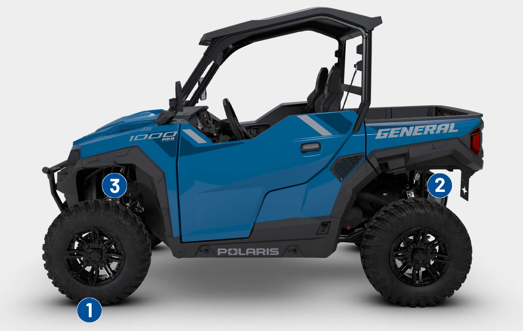 Le GENERAL est le véhicule crossover utilitaire/sport le plus confortable du marché. Doté de suspensions performantes couplées aux amortisseurs FOX Podium, il absorbe tous les défauts de la piste. Sa direction souple et réactive procure une maniabilité supérieure et les sièges baquets renforcés préservent votre corps pour rouler ou travailler plus longtemps.